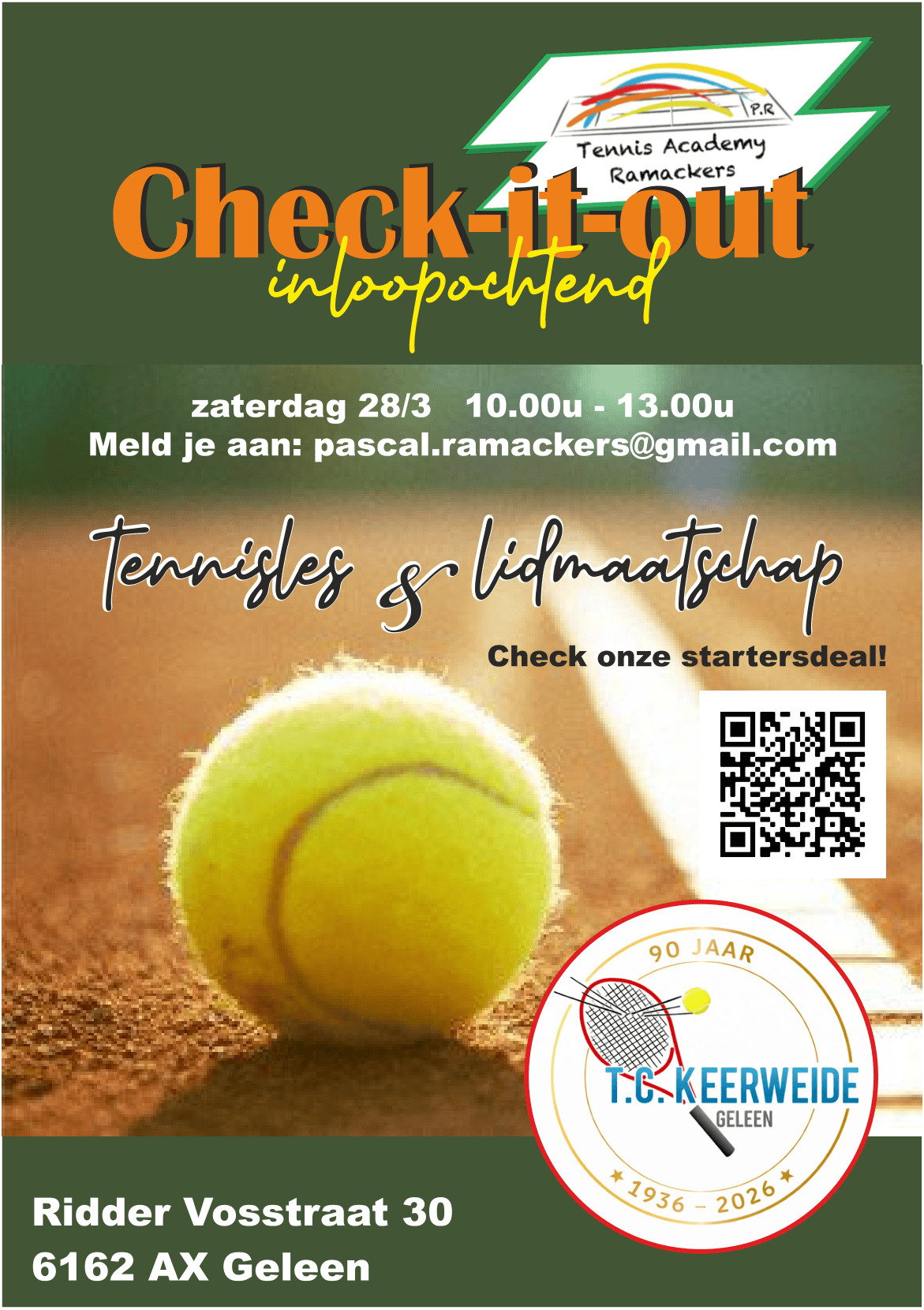 Zaterdag 28 maart van 10:00 tot 13:00 ben je welkom op het tennispark van TC Keerweide. Meld je aan door te mailen naar [email protected]